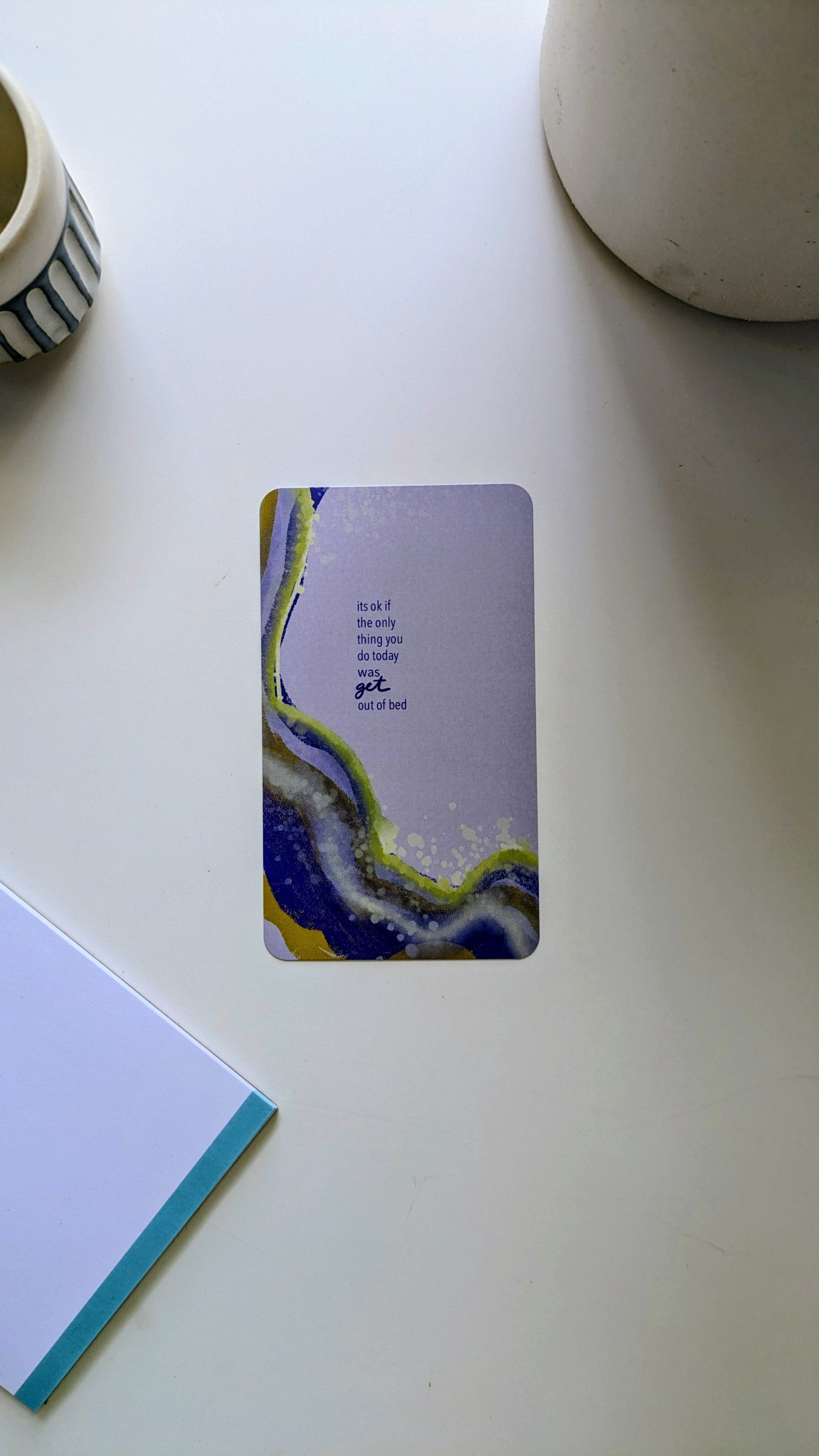 This deck started when I was deep in depression and needed words of encouragement that felt sincere, not fake. The affirmations I reached for were, unfortunately, out of reach. Later, I learned that these kinds of toxic positivity affirmations were only keeping me depressed; I was unable to connect with them so I thought I was the one who was broken.