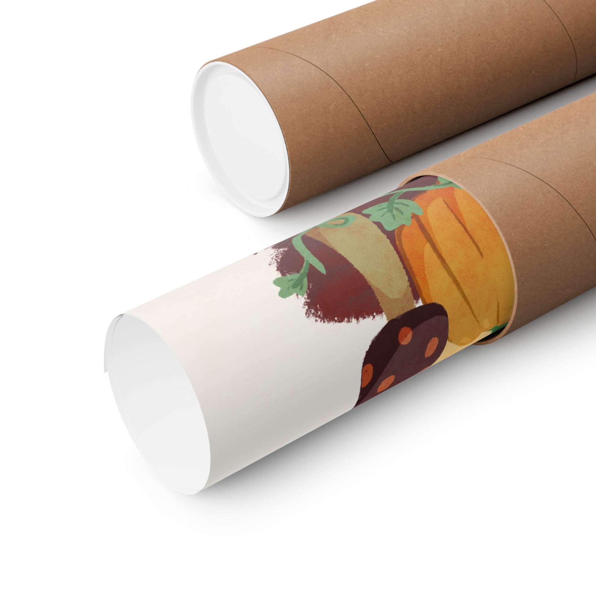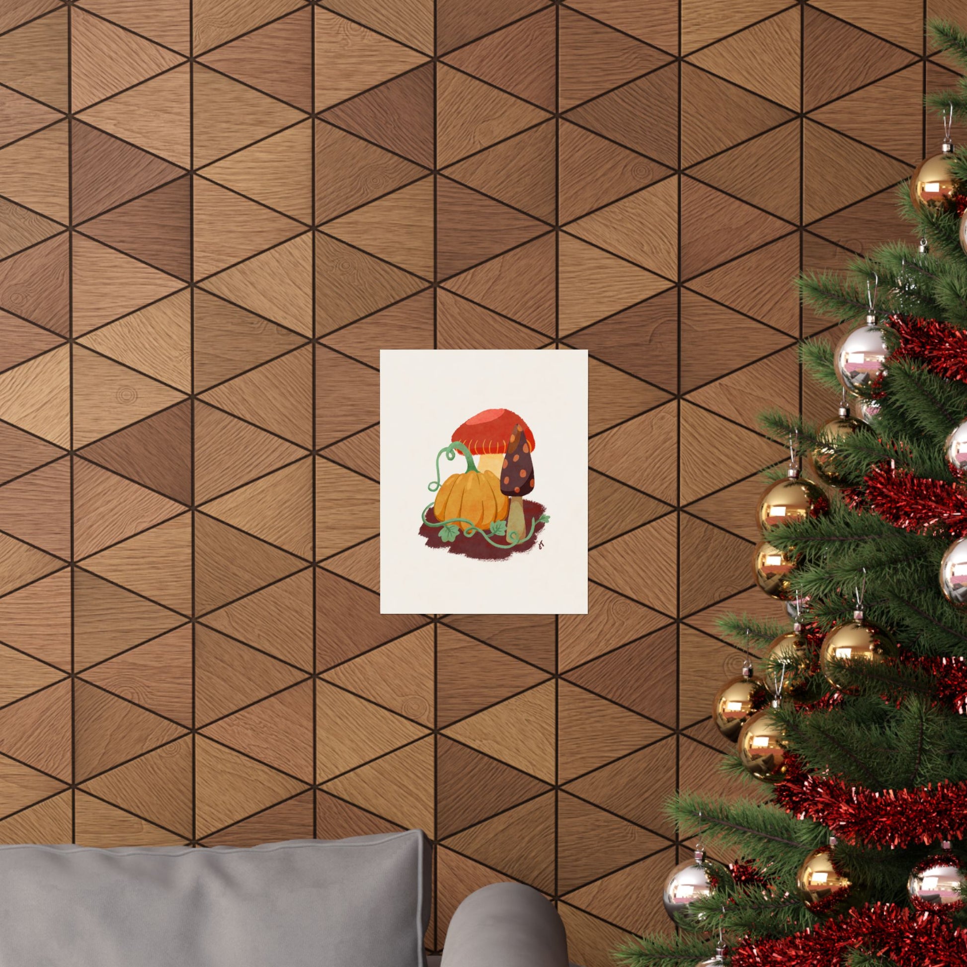 Bring a touch of autumn magic to your home with this enchanting illustration. Featuring a golden pumpkin nestled among curling green vines, this artwork is brought to life by two mushrooms: one tall, spotted brown mushroom and one glowing red toadstool.