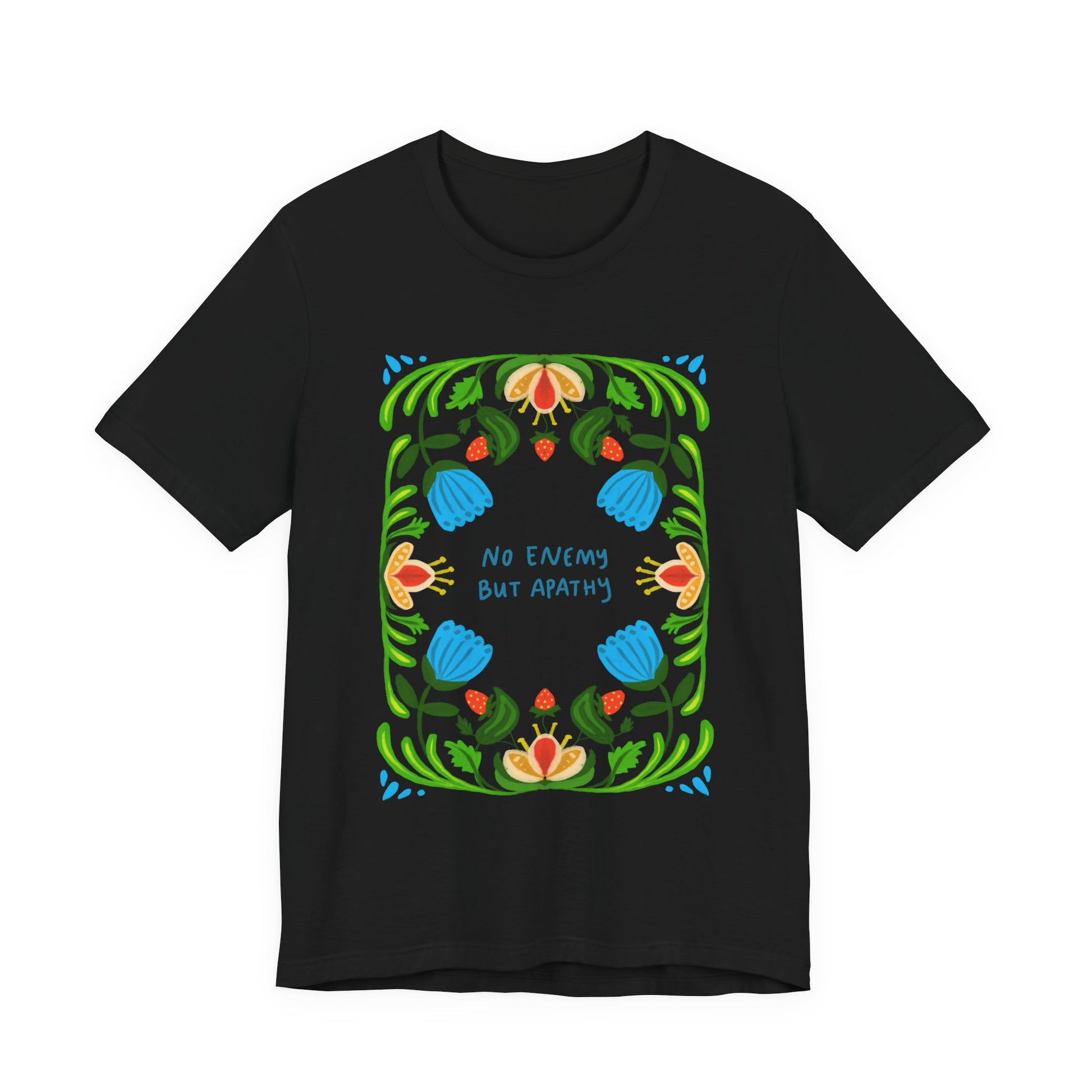 This jersey t-shirt features a floral nautre art illustration, with the phrase "No Enemy But Apathy," surrounded by a richly detailed botanical border. Inspired by quiet resistance, community care, and attention, it's a piece that pairs softness with conviction.